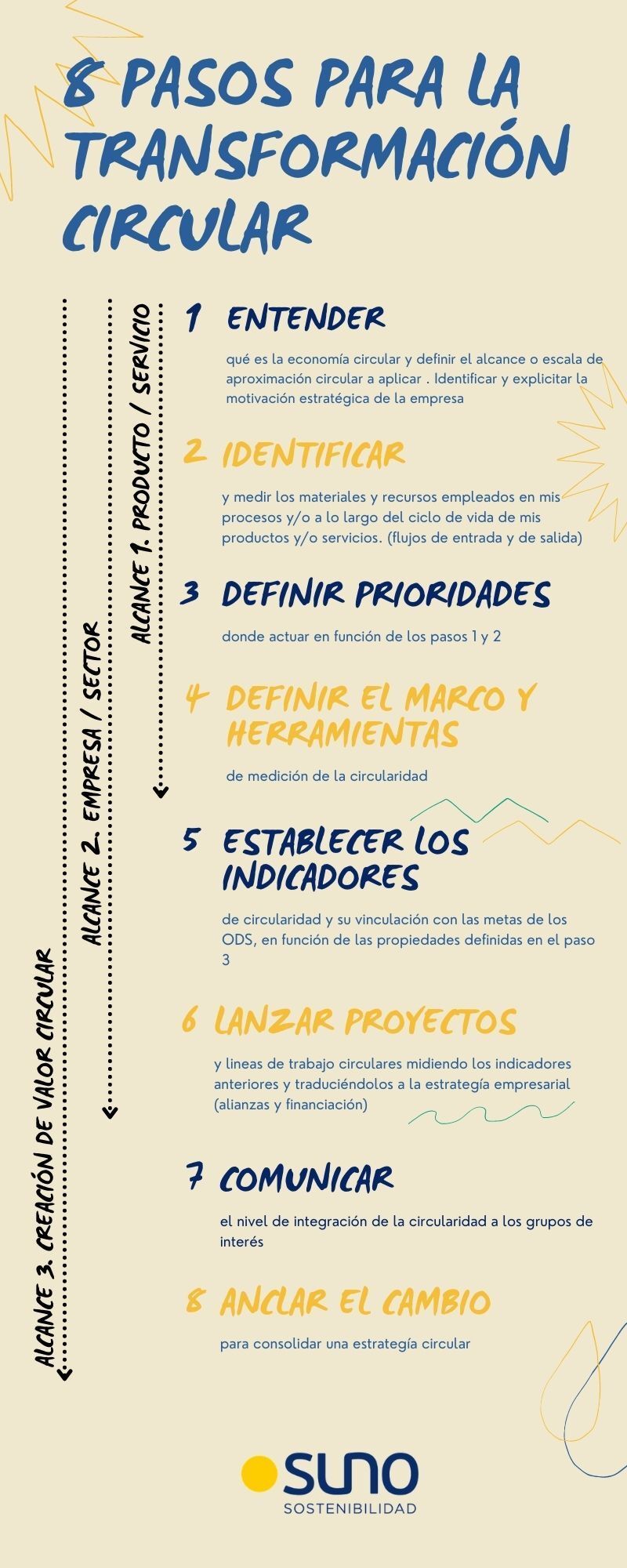 Desde Suno Sostenibilidad acompañamos a las empresas en su recorrido hacia una transformación circular basado en 8 pasos.